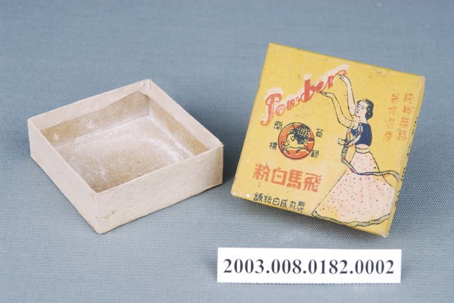 本文物為飛馬白粉盒,有上蓋跟基座。基座為白色,上蓋為黃色寫有「飛馬白粉」字樣,其上為飛馬牌之登陸商標,右寫有「新竹名產」、「純粹無鉛」,盒蓋上也有一名跳舞女子指著「powder 」之裝飾圖樣。白粉是早期婦女化妝用的粉底,又被稱為香粉或膨粉。新竹因氣候乾燥適合生產白粉,1925年當地開始生產無鉛白粉,日治時期當地有上百家製造白粉的業者,戰後由於貨物稅及外國化妝品進口競爭逐漸沒落。女性臉上的妝扮為其對特定生活之想像,相對地女性之美也時常受限於社會傳統價值觀,妝扮女性的化妝品及其附屬產品,則體現了社會審美觀和科技的變動。