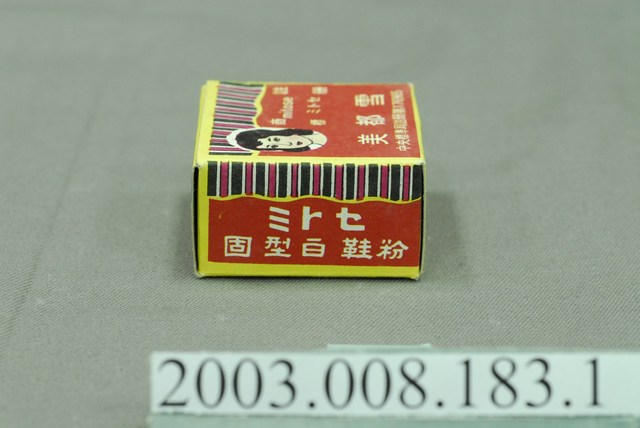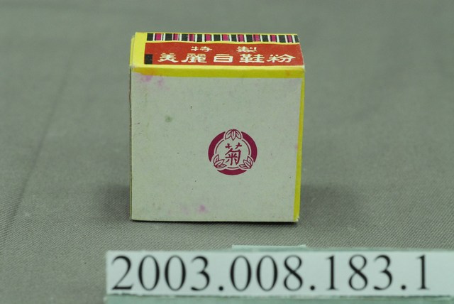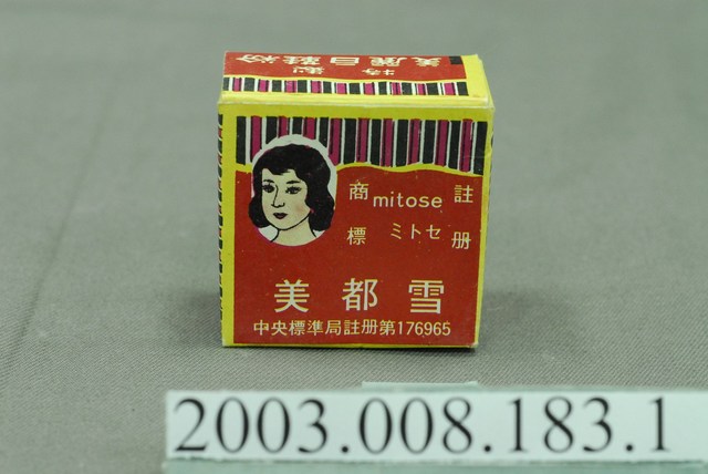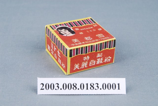 本件包裝盒為美都雪特製美麗白鞋粉部件之1,呈長4.7公分,寬4.9公分,高2.6公分。外型為方形扁盒狀,可上下開闔。正面印刷黃色底,上部以黑、紫、白3色直線條交替排列,交界處呈裂紋,左上方作橢圓開光,內印美女頭像,下段以紅色為底,上印白字「註冊商標」,橫書「mitose」、「ミトセ」。下方橫書「美都雪」、「中央標準局註冊第176965」。背面為白底,僅印有紫色商標,為圓環形,3端帶有3片竹葉,正中央帶有「菊」字樣。左右側採同樣版面,印有「ミトセ」、「固型白鞋粉」。上下側相同,印有「特製」、「美麗白鞋粉」。