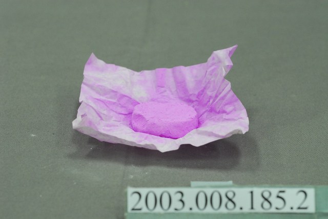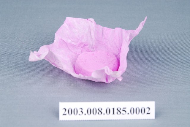 本件粉紅色粉餅為美莉白凸粉部件之2,呈長3.4公分,寬3.5公分,高1.1公分。粉紅色粉餅以白色紙張包裹,現已染色呈粉紅色澤,粉餅呈粉紅色澤,外型作圓形扁狀粉塊。香粉主要使用花東、蘇澳一帶生產之大理石,經打碎,加水研磨後加入香料製成,一般祭拜用或白鞋粉會經石磨反覆研磨2至3次,作化妝品使用之香粉研磨至5到6次之多,以達到細緻柔滑的程度。由於製作過程不添加其他化學物質與鉛,為早期婦女最天然的化妝品。本件香粉於製作過程中添加粉紅色料,可塗抹於臉頰作腮紅之用。香粉除作化妝品之用,也用於七巧節供品與挽面使用,由於其粉末細緻,也可作痱子粉。如遇小孩脹氣,傳統偏方會以香粉混合茶油或麻油塗抹腹部。