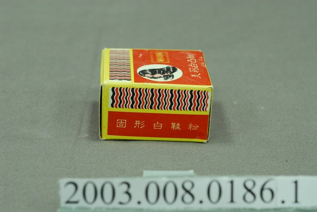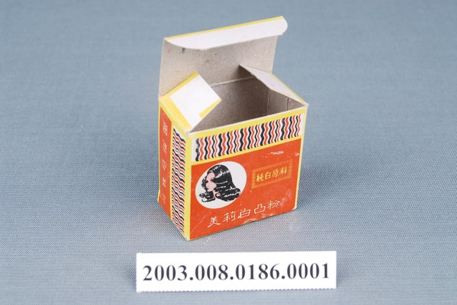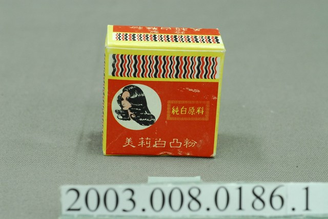 本件包裝盒為美莉白凸粉部件之1,呈長4.7公分,寬4.7公分,高2.6公分。外型為方形扁盒狀,可上下開闔。正面印刷黃色底,上部以黑、紅、白3色垂直波浪紋交替排列,左上方作圓形開光,內印長髮美女側面頭像,下段以紅色為框底,上印黃色花紋長方形框,以黃字橫書註明「純白原料」,下方同樣以白字橫書「美莉白凸粉」。左右側採同樣版面,印有「固型白鞋粉」。上下側相同,印有「特製」、「美莉白凸粉」。本包裝盒之版面設計應仿製著名美都雪白粉包裝。