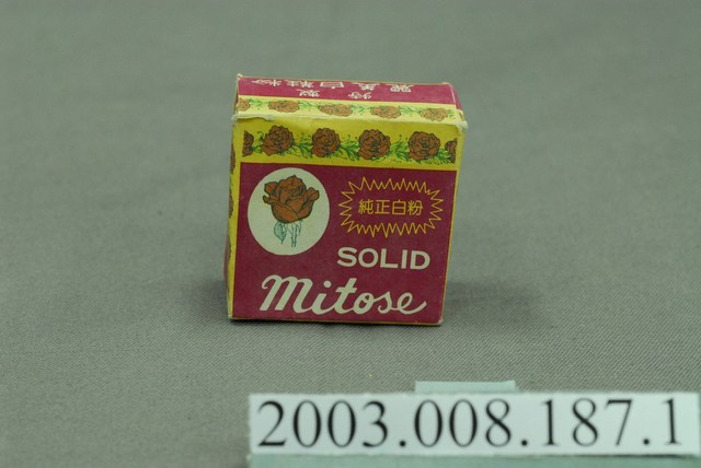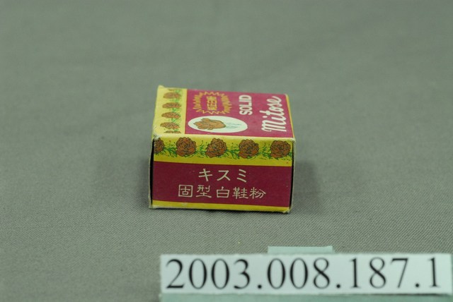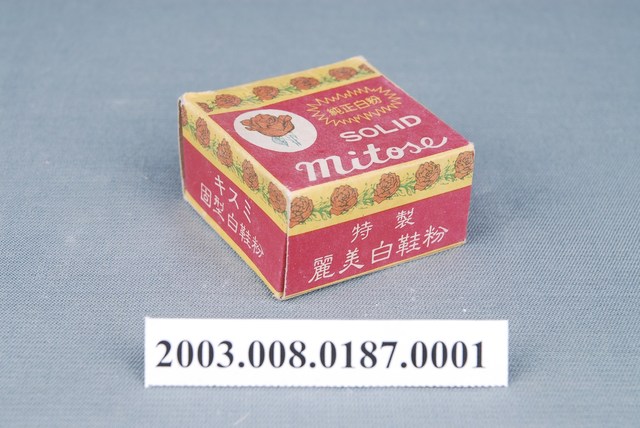 本件包裝盒為麗美白鞋粉部件之1,呈長4.9公分,寬4.9公分,高2.5公分。外型為方形扁盒狀,可上下開闔。正面上端印刷黃色底,以單朵玫瑰連葉圖案作連續紋路排列,左上方作白色圓形開光,內印紅色玫瑰折枝圖樣,下段以紅色為框底,又上印黃色爆炸紋路框線,以黃字橫書註明「純正白粉」,下方以白字橫書「SOLID」與「Mitose」。左右側採同樣版面,印有「キスミ」「固型白鞋粉」。上下側相同,印有「特製」、「麗美白鞋粉」。