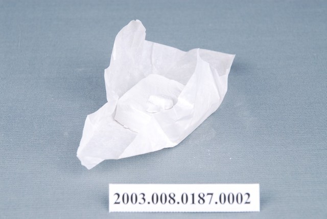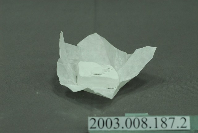 本件白鞋粉餅為美莉白凸粉部件之2,呈長4.1公分,寬4.4公分,高1.5公分。白粉餅以白色紙張包裹,粉餅呈潔白色澤,外型作方形扁狀粉塊,其邊緣現已崩碎多塊。白鞋粉與香粉均使用相同原料,以花東、蘇澳一帶生產之大理石為主,經打碎,加水研磨後,套模風乾而成。一般祭拜用或白鞋粉會經石磨反覆研磨2至3次,作化妝品使用之香粉研磨至5到6次之多,以達到細緻柔滑的程度。