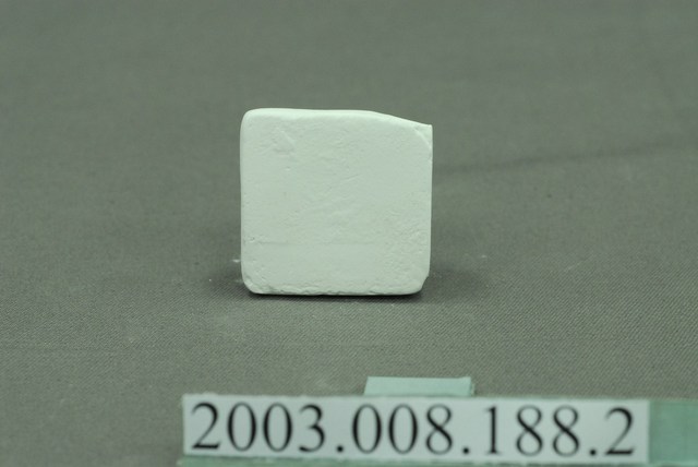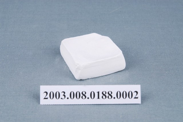 本件白鞋粉餅為頂好用白鞋粉部件之2,呈長3.9分,寬3.9公分,高1.4公分。白鞋粉餅無紙張包裹,粉餅呈潔白色澤,外型作方形扁狀粉塊,其邊緣一角崩落。白鞋粉與香粉均使用相同原料,以花東、蘇澳一帶生產之大理石為主,經打碎,加水研磨後,套模風乾而成。一般祭拜用或白鞋粉會經石磨反覆研磨2至3次,作化妝品使用之香粉研磨至5到6次之多,以達到細緻柔滑的程度。