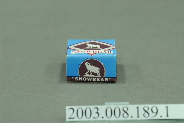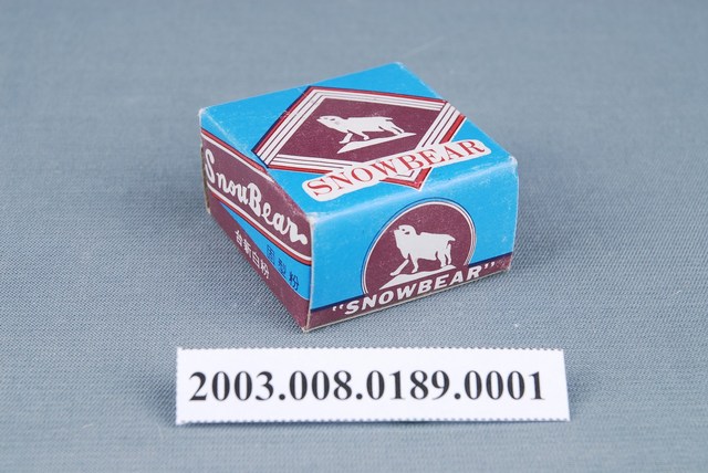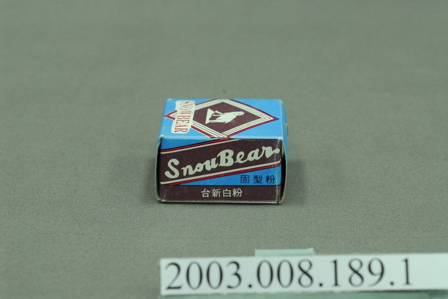 本件包裝盒為台新白粉部件之1,呈長4.6公分,寬4.9公分,高2.6公分。外型為方形扁盒狀,可上下開闔。正面以藍色為底色,中央以方菱形紅條框,內嵌2到白條框,框內以深咖啡色為底色,以白色剪影作熊側面全身像,頭部抬仰,前肢略挺,4足站立於山上,下端印刷白底紅字「SNOWBEAR」。左右側面採紅、白色條成斜框,內有白字「SnowBear」,下端印有「固型粉」與「台新白粉」。上下側面使用圓框內為熊形商標,下端橫書咖啡底白字「"SNOWBEAR"」。