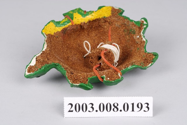 本物件為綠色烏龜造型釣魚玩具,其為軟木材質,正面外型為烏龜,整體上綠色顏料,輔以黃金色顏料勾勒龜殼花紋,龜殼正中央有棉繩露出,尾端綁住一個塑料小圓圈;背面未上顏料,單側冉有黃色顏料,整體可見為軟木材質,中間以棉繩捆住另一軟木,並有紅色橡皮筋勾住烏龜兩側,用以固定軟木。本物件與2003.008.0191、2003.008.0192、2003.008.0194、2003.008.0195、2003.008.0196應為同款釣魚玩具組。