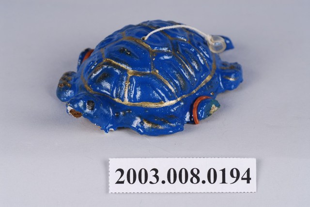 本物件為藍色烏龜造型釣魚玩具,其為軟木材質,正面外型為烏龜,整體上藍色顏料,輔以黃金色顏料勾勒龜殼花紋,龜殼正中央有棉繩露出,尾端綁住一個塑料小圓圈;背面未上顏料,整體可見為軟木材質,中間以棉繩捆住另一軟木,並有紅色橡皮筋勾住烏龜兩側,用以固定軟木(紅色橡皮筋已嚴重斷裂)。本物件與2003.008.0191、2003.008.0192、2003.008.0193、2003.008.0195、2003.008.0196應為同款釣魚玩具組。