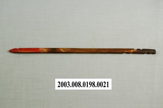 籤的材質主要為竹製品,呈長條形,籤頭多刻為葫蘆或其他形狀,其上並刻有干支或號碼,籤數必須與籤詩相符。籤存放於籤筒中,放置於供桌兩側,供民眾抽取。本件竹製籤枝的籤頭為箭尖形,籤枝露出籤筒部份漆上紅漆,籤尾有缺角造型,為標記籤號的符號,左側缺2角,右側缺4角。