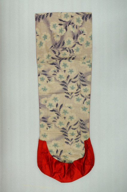 1.紅底花鳥紋椅套,長51.8cm、寬141cm、高4.2cm,此椅套正反面分別使用紅色綢緞與花草紋棉布合縫成一件,背面頂端有紅色綢緞倒口袋型包布,用以套在椅背上。裝飾紋樣部分,正面紋飾在椅背及椅腳部分。椅背部分繡有頭部為橘色的綬帶鳥與牡丹、蝴蝶,椅腳部分繡有蓮花及鴛鴦。綬帶鳥寓意長壽,牡丹代表富貴,蝴蝶也有長壽之意,鴛鴦與荷花象徵夫妻和美、永不分離。背面則是米色花草紋花布。此椅套寓意吉祥,從紋飾看來應屬於婚嫁用品。2.椅套可改變居家空間氣氛,大紅椅套通常是婚禮、慶壽或重大節日才會使用。