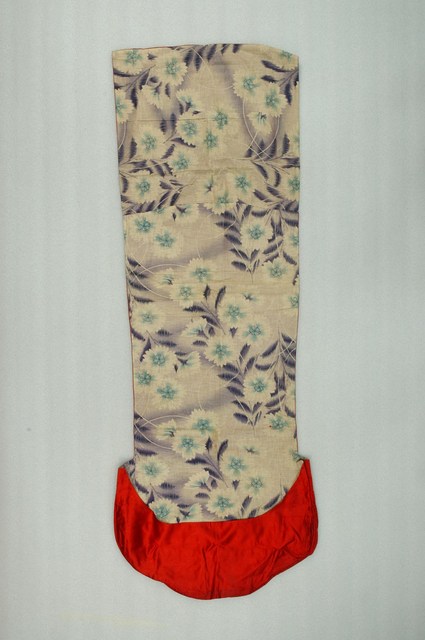 1.紅底花鳥紋椅套,長52.2cm、寬140.2cm、高4.3cm,此椅套正反面分別使用紅色綢緞與花草紋棉布合縫成一件,背面頂端有紅色綢緞倒口袋型包布,用以套在椅背上。裝飾紋樣部分,正面紋飾在椅背及椅腳部分。椅背部分繡有頭部為橘色面向左側的綬帶鳥,與牡丹、蝴蝶,椅腳部分繡有蓮花及鴛鴦。綬帶鳥寓意長壽,牡丹代表富貴,蝴蝶也有長壽之意,鴛鴦與荷花象徵夫妻和美、永不分離。背面則是米色花草紋花布。此椅套寓意吉祥,從紋飾看來應屬於婚嫁用品。2.椅套可改變居家空間氣氛,大紅椅套通常是婚禮、慶壽或重大節日才會使用。
