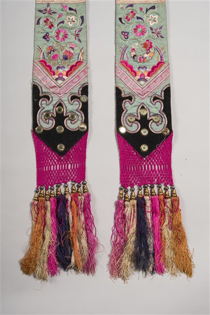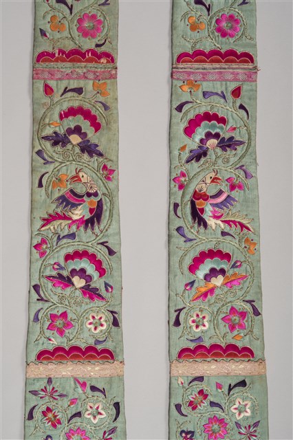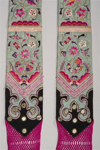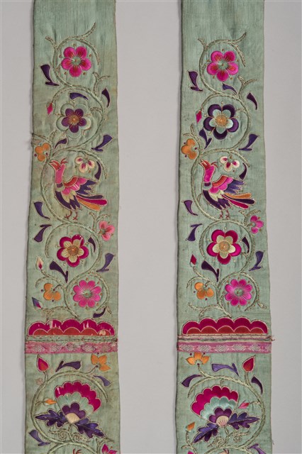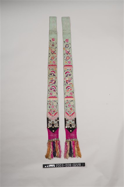 此對劍帶以淺綠色的絲緞作面料,背面以桃紅棉布做襯底(褪色嚴重),帶身刺繡圖案分為三段,每段以粉紅色緹花織帶貼飾隔開,最底層刺繡雙魚蓮花(另一邊繡噴水的鰲魚)圖案,底邊繡襯滾滾的水浪和飄盪的水草,其他二層則刺繡彩鳳、喜鵲梅花等圖紋,絲線用色鮮明亮麗,搭配平針、長直針、搶針、套針、鋪針、扎針、纏針、打籽繡等技法,加上金蔥線框邊的盤金釘線繡,構築出花葉盤曲捲繞的繁盛富麗效果,是臺灣南部六堆客家地區的典型繡品。劍帶底部以黑色絨布「貼布挖雲」繡成如意雲頭紋飾,再加上金屬亮片釘縫,最末端以亮麗的桃紅色絲線編結網絡,綴飾各色絲穗流蘇裝飾和銀珠、葫蘆穗頭(寓意福祿),色彩繽紛亮麗,裝飾華麗貴氣。