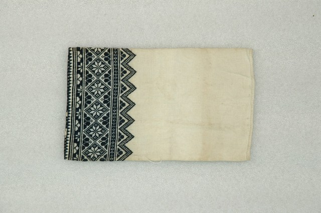 此飾褲為單層結構,以白色棉布製作,下端以黑色絲線做數紗刺繡,圖紋多為幾何圖案,如三角形、十字紋、菱形、八角花等,以單色線刺繡鋪滿布底,露出白色棉布顯現出圖紋的效果,花紋簡單循環花樣,形成單純樸質之美。「數紗」刺繡技法是指刺繡時,以數布料紗線格子的方式下針,在紗格之間以平針刺繡圖案,與「戳紗」技法類似,但戳紗通常是在經緯紗網格較疏的材質上做絲線填繡,數紗則在一般的平紋棉布上做刺繡。