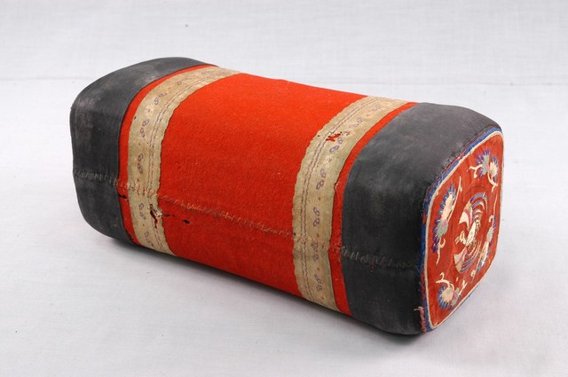 1. 本件為左側枕頭。由於大紅枕頭為傳統嫁妝的一部份,故都是成雙成對出現。枕頭型制為常見的柱狀。在枕頭兩側以黑色布包邊,與大紅枕頭形成對比。繡樣部分,以套針、纏針繡有鳳凰牡丹紋。鳳凰、牡丹寓意富貴吉祥。此件枕頭保存情況比套組中的右側枕頭好,雖然也有破損,但相對較完整。此件枕頭為妻子使用。2.本件購自林漢章先生,產地為臺中霧峰。大紅被套、枕套為傳統婚禮中新娘嫁妝之一,其上的紋樣多有吉祥寓意祝福新嫁娘婚後生活順利,並可由此看出新嫁娘的手藝。