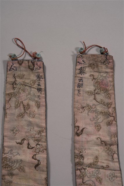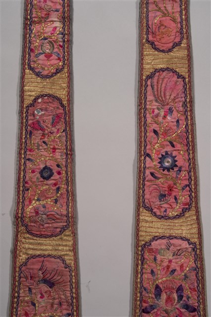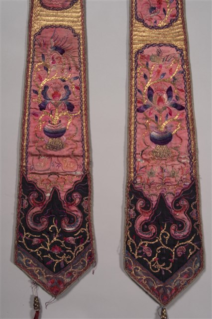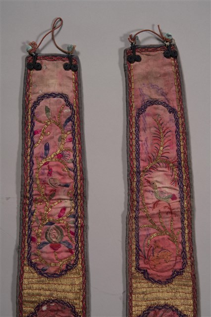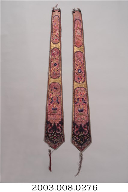 此對劍帶以紅色棉布作為底布(褪色),帶面四周以橄欖綠棉布包緄,內緣以金紅相間的細織帶貼飾,再以金蔥線平金滿繡搭配織帶框邊,做出三段開光圖紋。劍帶背面以白底印花棉布做底襯,印花圖案有蝙蝠雙銅錢(福在眼前),牡丹、佛手、壽桃(富貴福壽),背面上方均有「黎云朋」字樣。帶身以絲線刺繡花瓶、蓮花、彩鳳、公雞、雀鳥、龜鹿等圖紋,刺繡針法以盤金釘線為主,使得繡面上顯得金光閃閃、光彩奪目。另外,搭配平針、鋪針、紮針、搶針、長直針、纏針、打籽繡等技法,繡面上花朵枝葉繁茂、彩鳳飛翔,呈現出平安富貴、福祿長壽的意境,劍帶底部以黑色絨布「貼布挖雲」繡成鴟鴞狀的如意雲頭紋飾,下端點綴葫蘆頭絲穗流蘇(寓意福祿百歲),整體造型光彩瑰麗,充滿華麗喜氣。