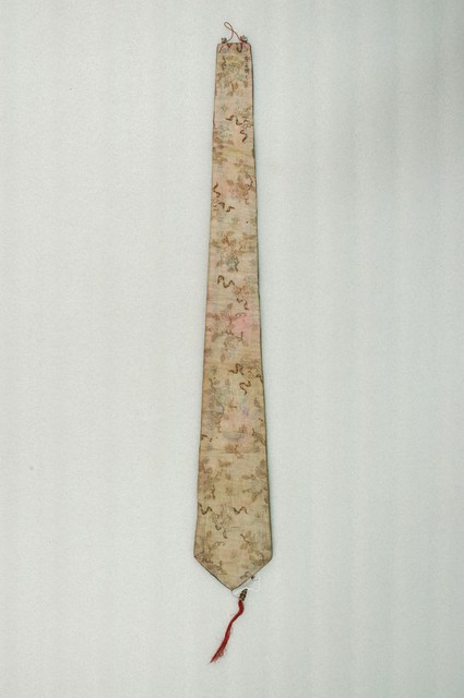 此劍帶長13.2cm、寬110.5cm、高1.5cm,以紅色棉布作為底布(褪色),帶面四周以橄欖綠棉布包緄,內緣以金紅相間的細織帶貼飾,再以金蔥線平金滿繡搭配織帶框邊,做出三段開光圖紋。劍帶背面以白底印花棉布做底襯,印花圖案有蝙蝠雙銅錢(福在眼前),牡丹、佛手、壽桃(富貴福壽),背面上方均有「黎云朋」字樣。帶身以絲線刺繡花瓶、蓮花、彩鳳、公雞、雀鳥、龜鹿等圖紋,刺繡針法以盤金釘線為主,使得繡面上顯得金光閃閃、光彩奪目。另外,搭配平針、鋪針、紮針、搶針、長直針、纏針、打籽繡等技法,繡面上花朵枝葉繁茂、彩鳳飛翔,呈現出平安富貴、福祿長壽的意境,劍帶底部以黑色絨布「貼布挖雲」繡成鴟鴞狀的如意雲頭紋飾,下端點綴葫蘆頭絲穗流蘇(寓意福祿百歲),整體造型光彩瑰麗,充滿華麗喜氣。