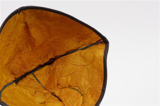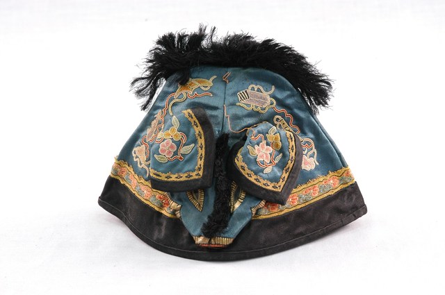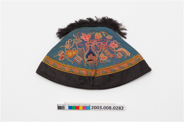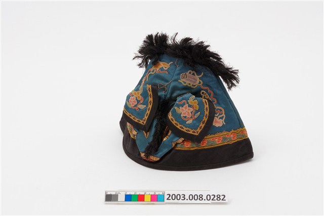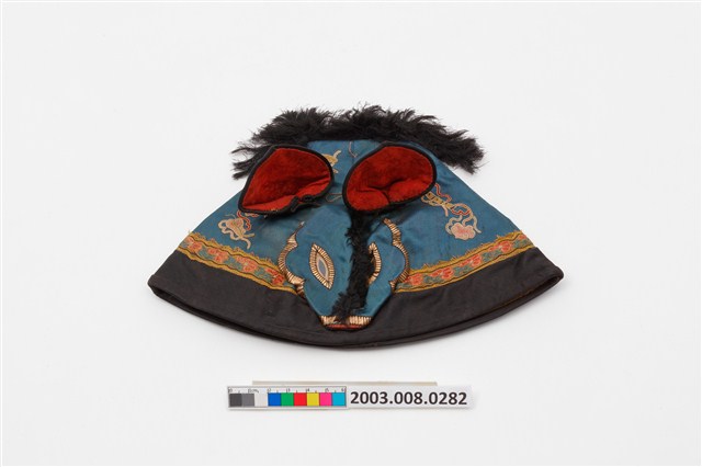 1. 藍黑地黑頂穗豬頭碗帽,以藍綠色和黑棉布裁製成碗帽形式,帽前方縫製小豬頭,小豬據有兩片大耳、小眼睛與長豬鼻,藍布與黑布交接處以織帶相接,帽身其餘處以彩線繡有梅花、桃花、蓮花、蓮藕、蓮葉、花瓶、笛子、如意、錢幣等紋樣。帽頂有一撮黑色短流蘇,代表頭髮。 碗帽內裡為金色,耳朵的內裡為紅色,造型十分可愛。2. 碗帽形狀如倒扣的碗,罩在頭上以保護頭部。