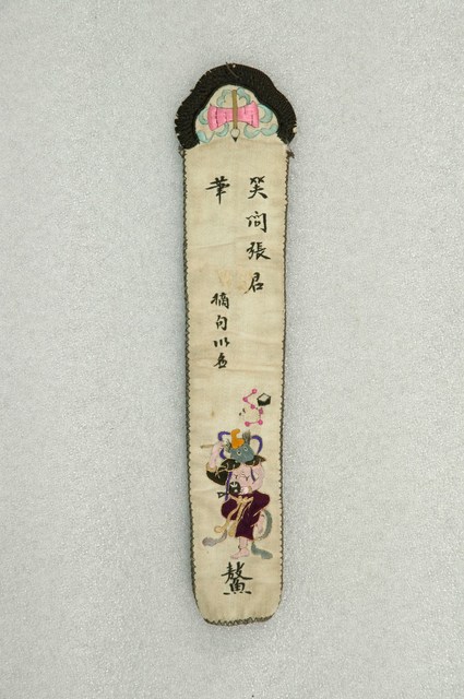 本文物為置筆用具,刺繡、布料製品,筆袋內部為紅色布料、黑色滾邊。正面布料為深紫色,圖案右上方有一太陽,中間繡有「日」字,主要圖案為一隻白鶴站立於岩石松樹前,前景為竹葉裝飾,松鶴延年圖有長壽之意。背面布料為白色,最上方圖案為粉紅色筆擱上一枝毛筆,上有「笑問張君 筆 摘句以應」字,下方有一字「鰲」與吉祥物鰲魚圖樣,有獨占鰲頭之意。