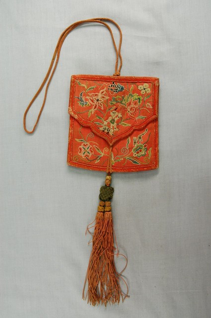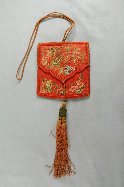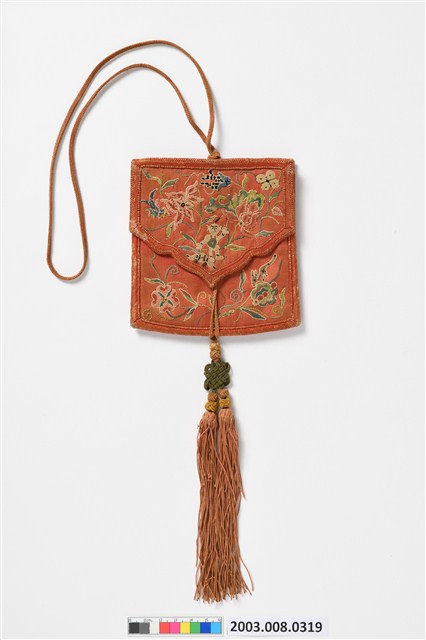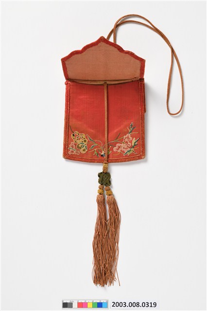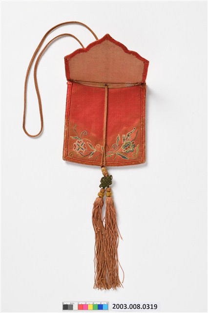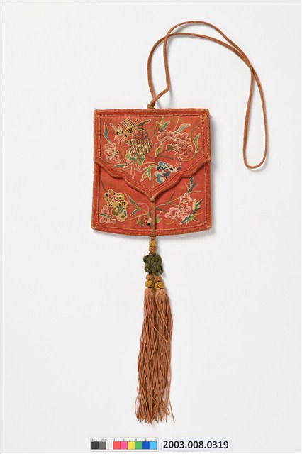 2003.008.0319 紅地花鳥嬰童紋繡荷包