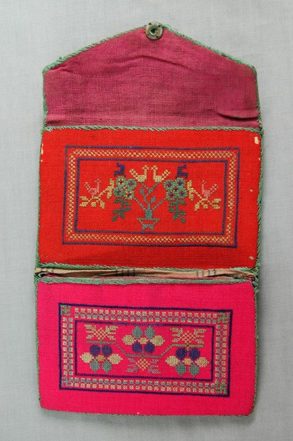 2003.008.0332 花鳥幾何紋十字繡兩摺褡褳荷包