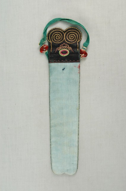 本文物為置筆用具,布料刺繡製品,有一布蓋,正面為深藍色與鉻黃拼布,右行「果然奪得錦」,左行「橋峰 中書軍氏」,背面為淡藍色素面布料,黑色布蓋繡有螺旋紋與雲紋,有好運的諧音之意,上方有一掛繩,左右串有紅色珠子,布料滾邊。