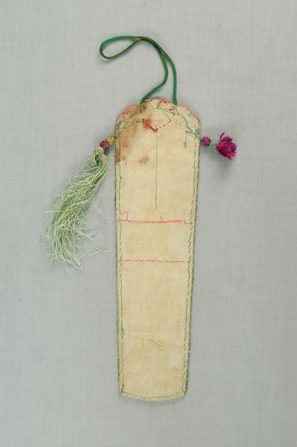 1.本文物為筆袋,布料刺繡製品,多色布料拼接,上方右邊有「助文人高攀丹桂」,左邊有「偶書」,中間繡有鯉魚,有魚躍龍門之意,中下有「扶學士直上青雲」,下方有「中書」。上方有一掛繩,左右有淺綠色流蘇,左邊已遺失,背面為淺色布料。2.明清扇套的刺繡紋樣多為詩詞、水墨;清式扇套繡法緊密對稱而少留白。