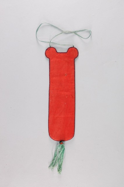 本文物為置筆用具,布料刺繡製品,淺色底布,上方有二耳狀,書寫「別人懷寶劒 我有筆如刀 朱入書 」,下方布料為淺綠色,繡有人物、涼亭、蝴蝶等圖案,布料滾邊。背面為紅色布料,有一掛繩,下方用流蘇裝飾。