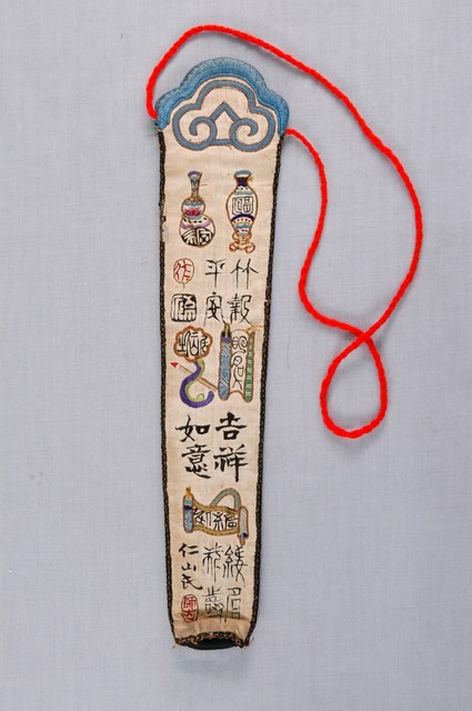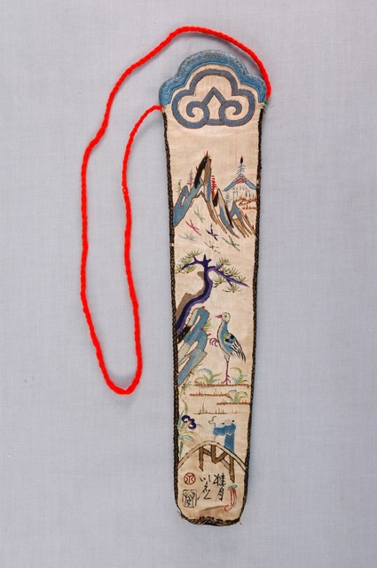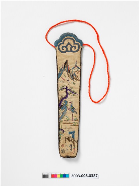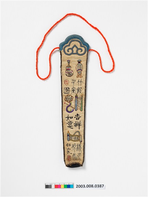 2003.008.0387 白棉地繡博古圖詩文扇袋