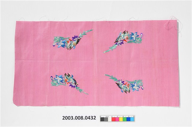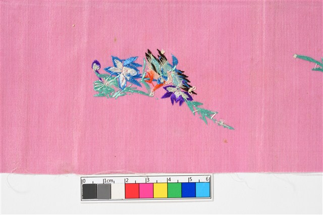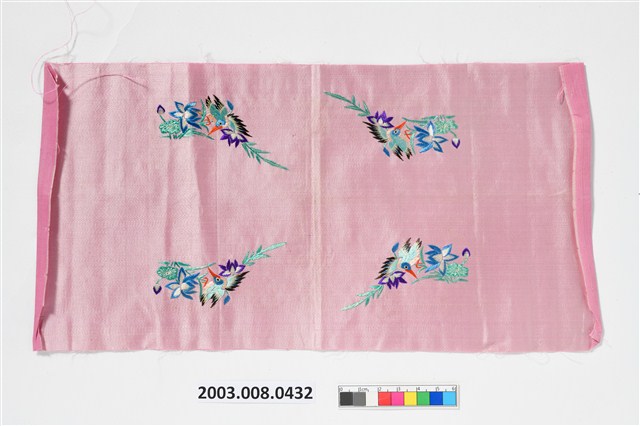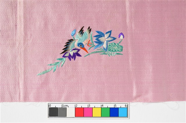 2003.008.0432 粉紅綢地繡翠鳥荷花紋弓鞋面繡片