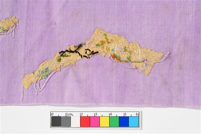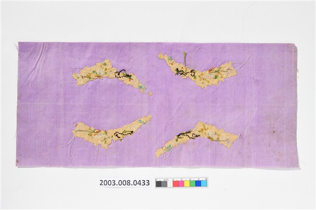 2003.008.0433 粉紫綢地繡花草靈芝紋弓鞋面繡片