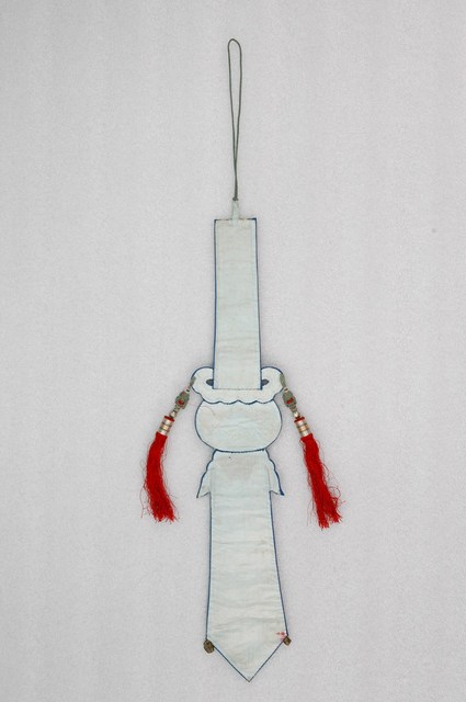 此劍帶背面以米白色絲緞製作底布(正面被納紗滿繡蓋住無法辨識),緣邊以藍色棉布鑲緄,帶身分成三段,上下二段是普通劍帶形式,中間部份做成香爐造型,香爐下面有相對稱的如意雲紋裝飾,周邊均以藍色棉布鑲緄,使圖案輪廓更加明顯突出。香爐兩旁垂飾紅色絲穗流蘇和銀珠、結飾。劍帶內部以各色絲線搭配納紗滿繡技法繡出許多圖紋,有各式幾何圖案、卍字紋、雙錢紋、盤長紋、八角花、回紋等等,劍帶上、下各有成對的詩句:上端是「巷迎七車香」,下端是「五世其昌」。刺繡技法中使用垂直針搭配數布紗格眼的方式,在紗格之間刺繡圖案者稱為「納紗」(與數紗技法類似,納紗者布料格眼較疏而明顯),刺繡圖案空留部份紗地者稱為「戳紗」,如果將整個布面滿繡不留紗地者稱為「納繡」。