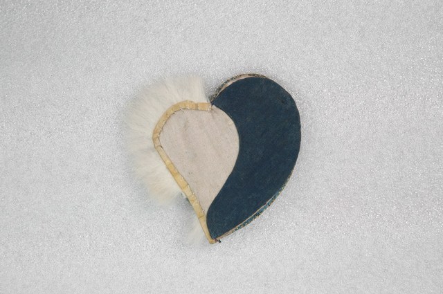 1.本件為兩件一組的耳罩中,繡女性抱著孩童紋樣的左側耳罩。黑色底布,以綠色布包邊,其上繡有幾何紋樣。邊緣絨毛除了保暖,也有裝飾效果。主要紋樣部分,以人物紋為主,旁邊裝飾纏枝花卉,特別之處在於以打籽繡凸顯主要紋樣,讓整件作品主次分明。2. 此件文物購自林漢章先生,耳罩為臺灣先民常使用的生活用品,多使用在婦女、兒童身上。通常造型為心型,內有墊裡保暖。