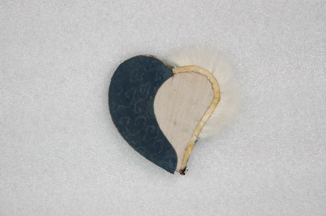1.本件為兩件一組的耳罩中,繡男子持花紋樣的右側耳罩。黑色底布,以綠色布包邊,其上繡有幾何紋樣。邊緣絨毛除了保暖,也有裝飾效果。主要紋樣部分,以人物紋為主,旁邊裝飾纏枝花卉,特別之處在於以打籽繡凸顯主要紋樣,讓整件作品主次分明。2. 此件文物購自林漢章先生,耳罩為臺灣先民常使用的生活用品,多使用在婦女、兒童身上。通常造型為心型,內有墊裡保暖。