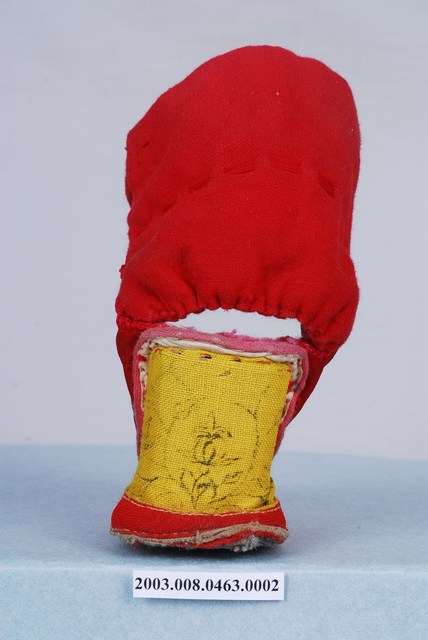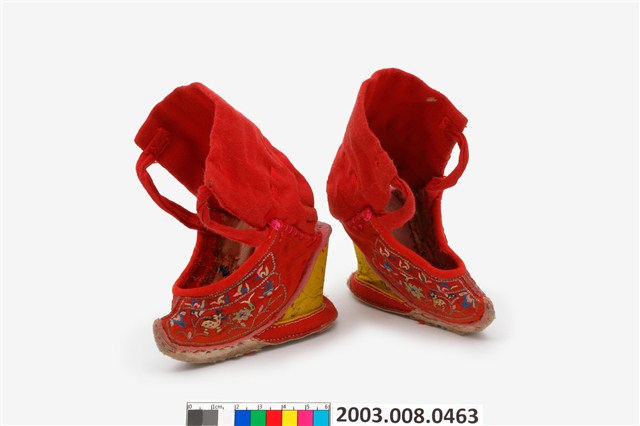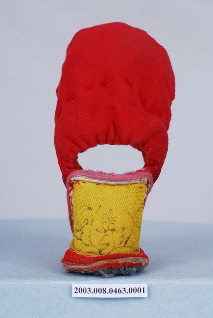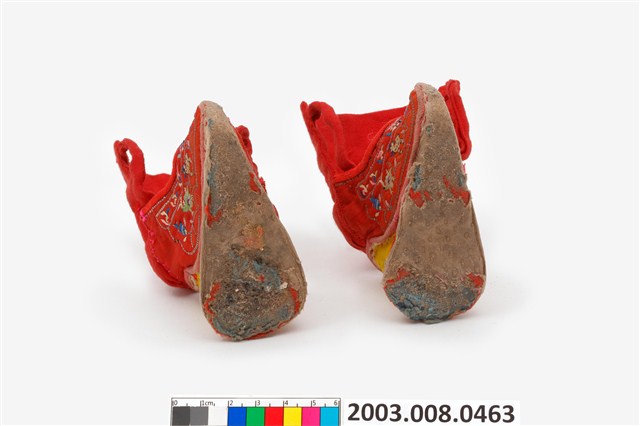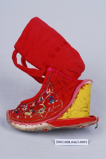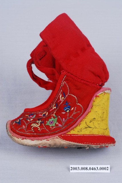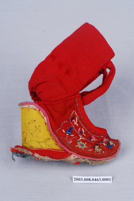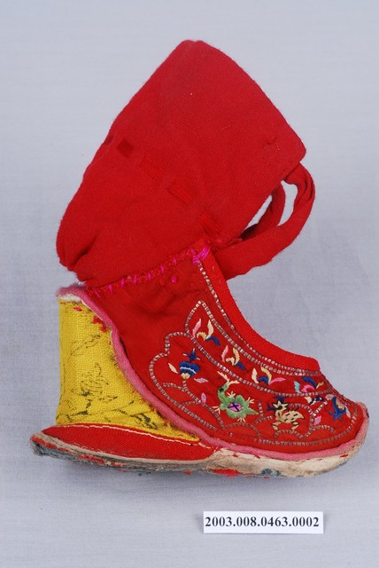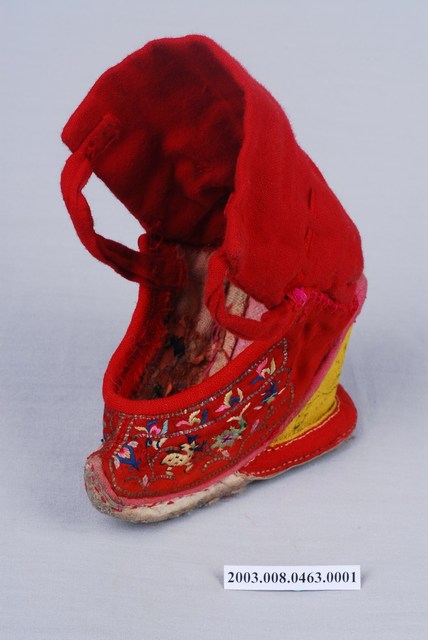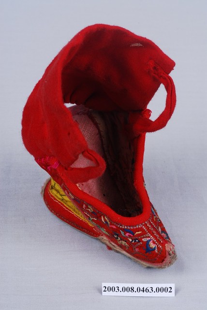 2003.008.0463.0001 大紅棉地繡鹿龜石榴紋高跟弓鞋左足