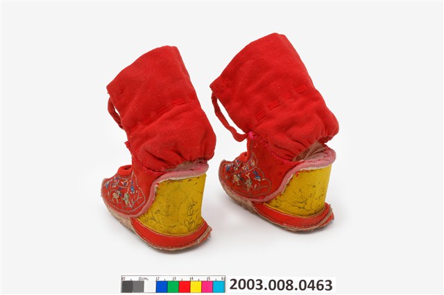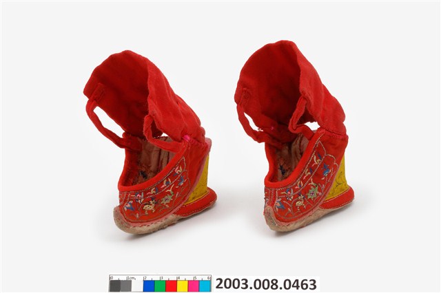 2003.008.0463 大紅棉地繡鹿龜石榴紋高跟弓鞋