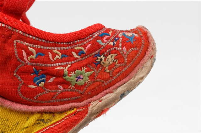2003.008.0463.0002 大紅棉地繡鹿龜石榴紋高跟弓鞋右足