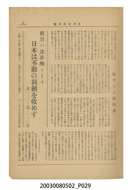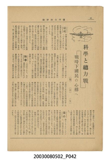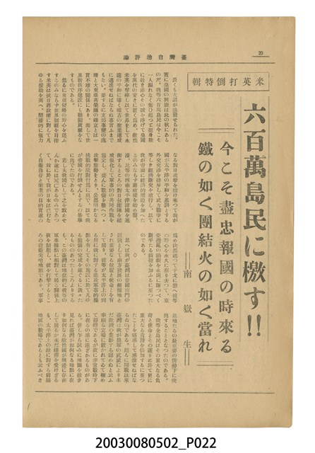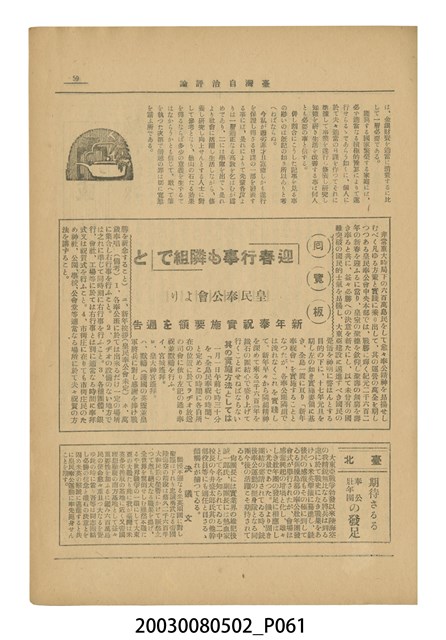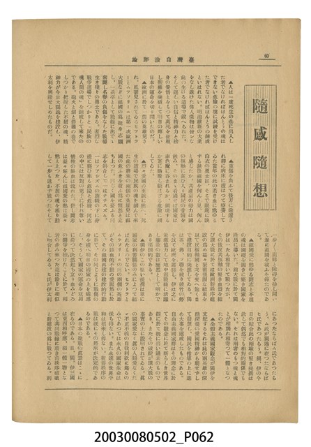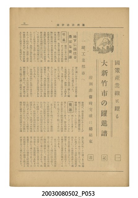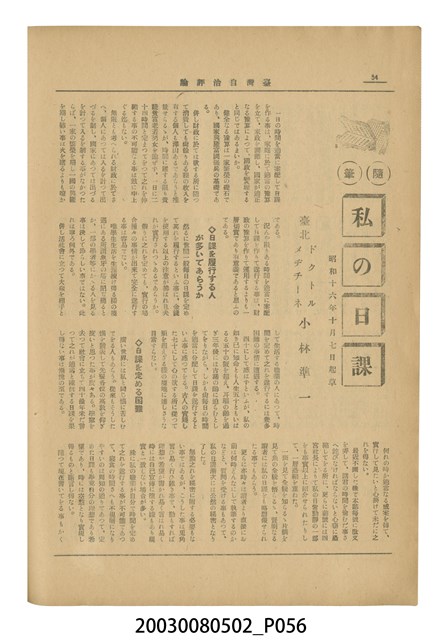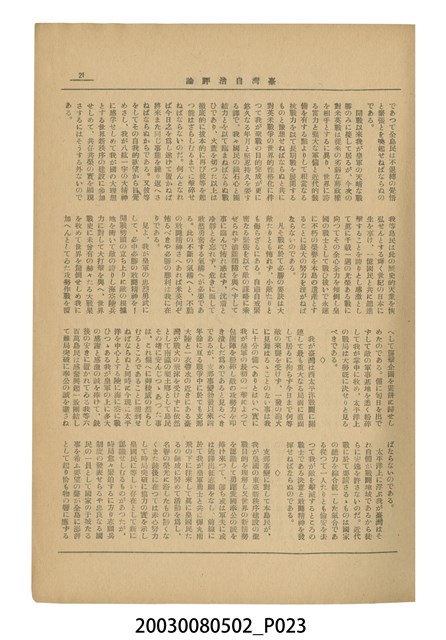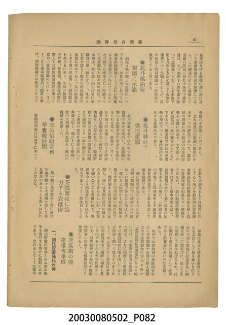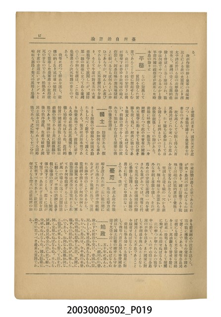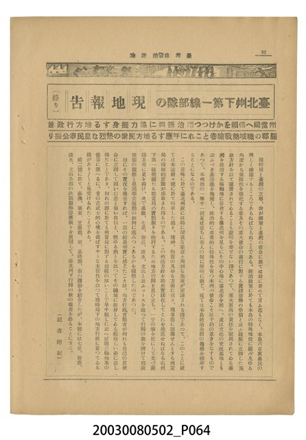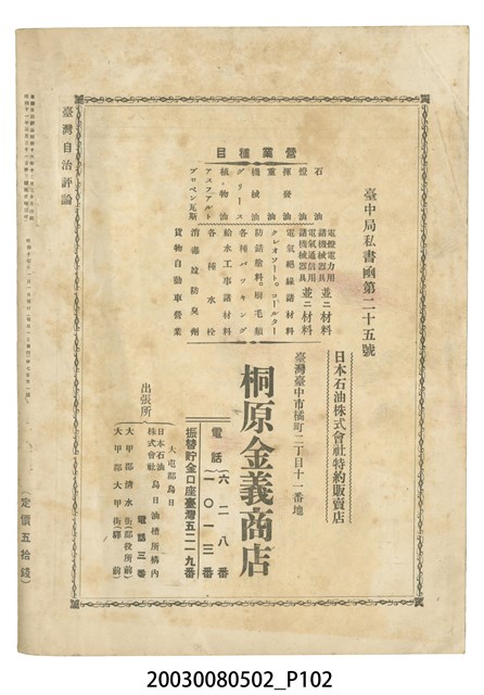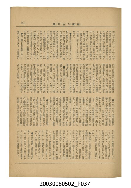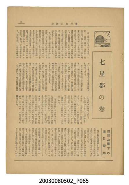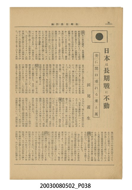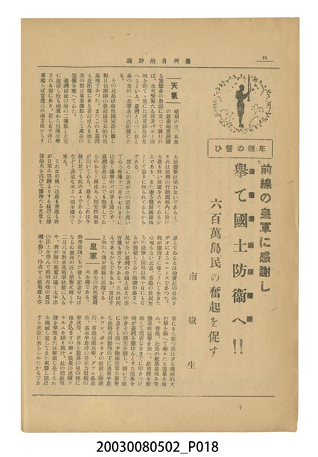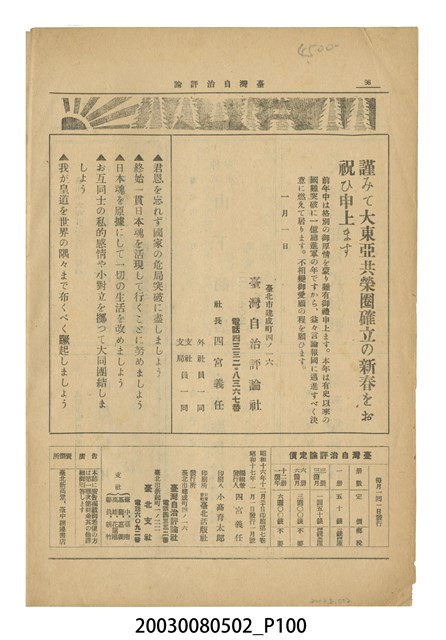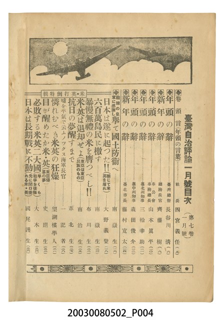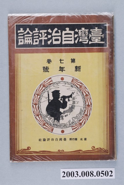 此為一紙質雜誌,並在封面上方寫有本雜誌的標題以及該雜誌的期號,下方則寫上此雜誌的發行者,而封面中間則有本號雜誌的軍人以及日本的插圖。此書為臺灣自治評論社出版之《臺灣自治評論》第七卷新年號。 此物件為《臺灣自治評論》,四宮義任編輯,並於1936年由臺灣自治評論社發行,目的是為配合1935年臺灣總督府實行地方制度改正發行,此刊物的內容包含地方上的自治、政治、經濟等問題與現象,為研究日治時期地方景象的重要書籍之一。 此物件與日治時期的地方自治有關,日本政府於1895年接收臺灣之後,統治制度隨時局變化屢有更替。1919年起施行文官總督制,首任文官總督田健次郎致力推行「地方自治」制度,臺灣各地的地方行政組織漸次走向自治化,但在殖民地高度集權的法律制度下,地方行政組織的從屬色彩濃厚。受到一戰前後「大正民主風潮」、「民族自決」、「朝鮮三一獨立運動」等因素影響,臺灣的知識份子,在1920年代以社會運動的形式於臺灣各地倡導地方自治理念,並於1921至1934年發動多達15次的臺人赴東京國會請願活動。隨著地方政治制度改革運動的日益政治化,臺灣總督府終於1935年賦予地方行政機關法人地位,施行首次選舉、代議等自治措施。
