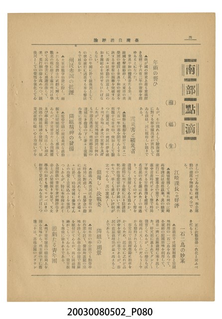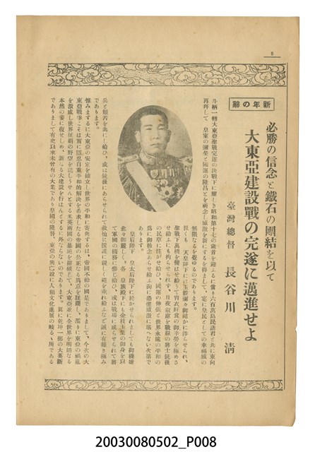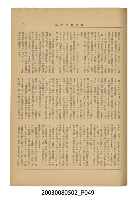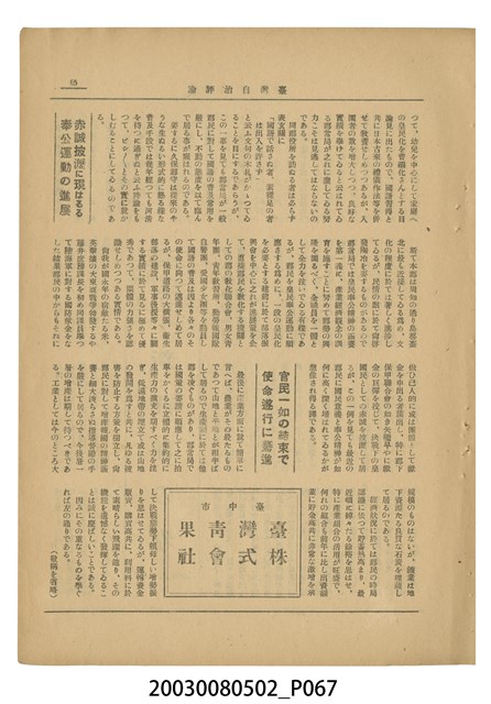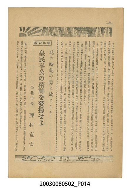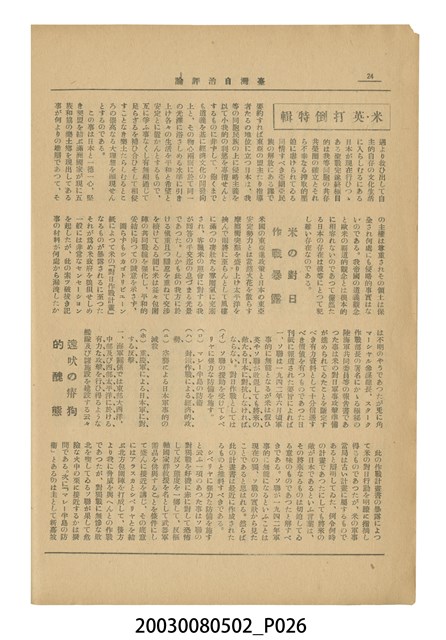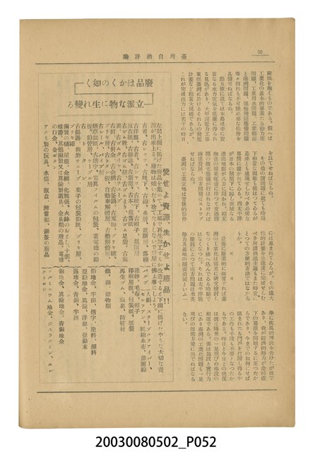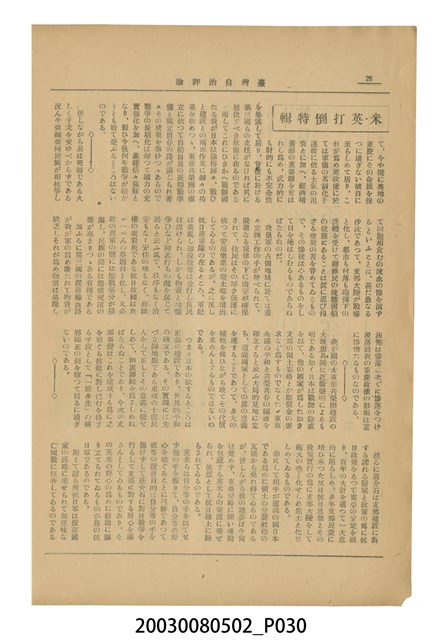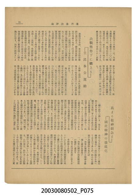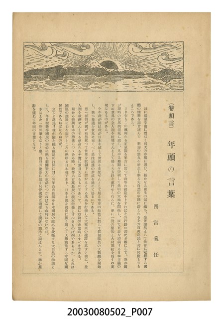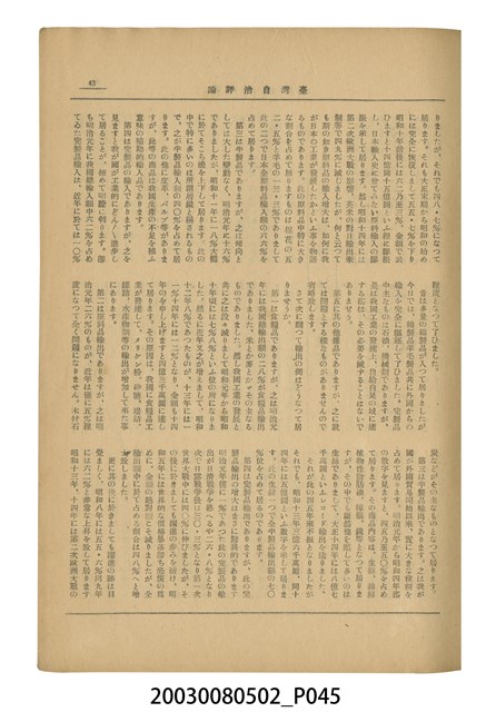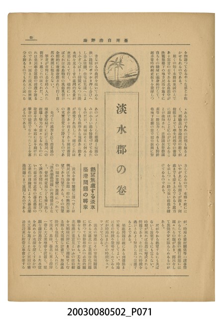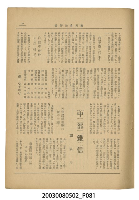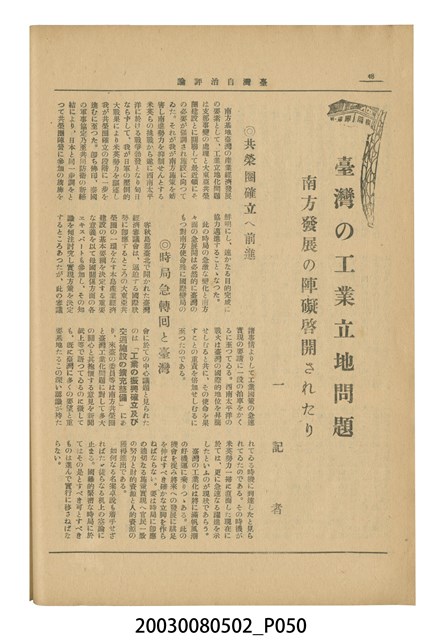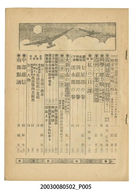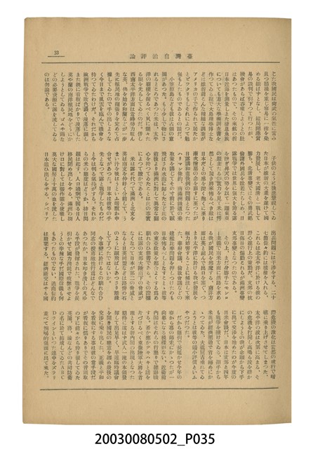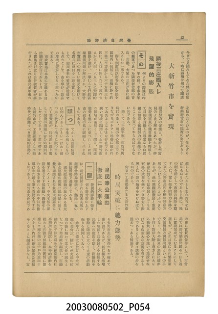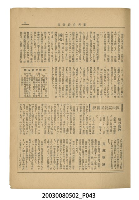 此為一紙質雜誌,並在封面上方寫有本雜誌的標題以及該雜誌的期號,下方則寫上此雜誌的發行者,而封面中間則有本號雜誌的軍人以及日本的插圖。此書為臺灣自治評論社出版之《臺灣自治評論》第七卷新年號。 此物件為《臺灣自治評論》,四宮義任編輯,並於1936年由臺灣自治評論社發行,目的是為配合1935年臺灣總督府實行地方制度改正發行,此刊物的內容包含地方上的自治、政治、經濟等問題與現象,為研究日治時期地方景象的重要書籍之一。 此物件與日治時期的地方自治有關,日本政府於1895年接收臺灣之後,統治制度隨時局變化屢有更替。1919年起施行文官總督制,首任文官總督田健次郎致力推行「地方自治」制度,臺灣各地的地方行政組織漸次走向自治化,但在殖民地高度集權的法律制度下,地方行政組織的從屬色彩濃厚。受到一戰前後「大正民主風潮」、「民族自決」、「朝鮮三一獨立運動」等因素影響,臺灣的知識份子,在1920年代以社會運動的形式於臺灣各地倡導地方自治理念,並於1921至1934年發動多達15次的臺人赴東京國會請願活動。隨著地方政治制度改革運動的日益政治化,臺灣總督府終於1935年賦予地方行政機關法人地位,施行首次選舉、代議等自治措施。