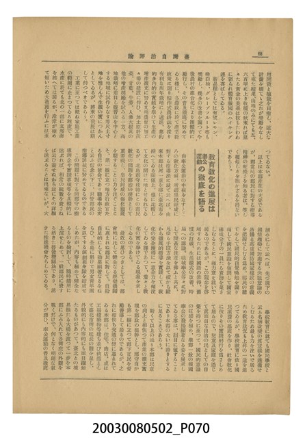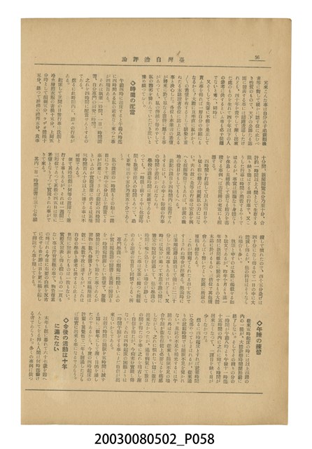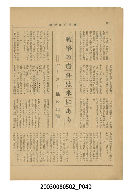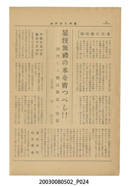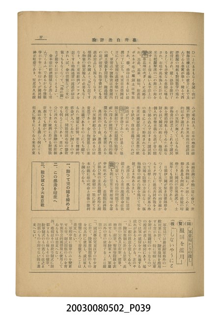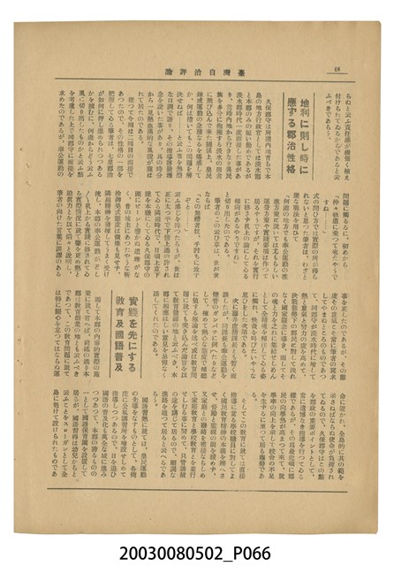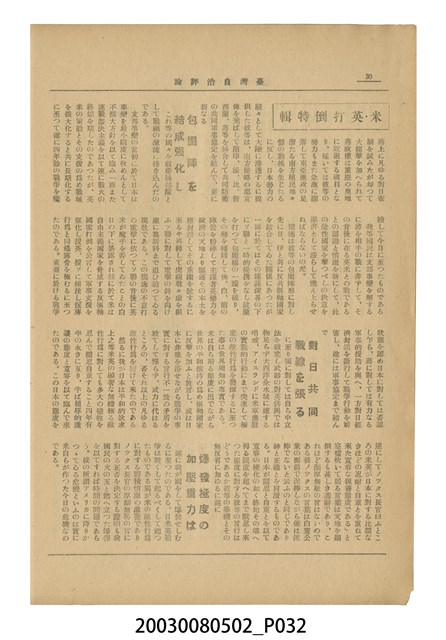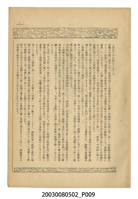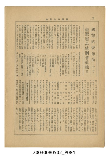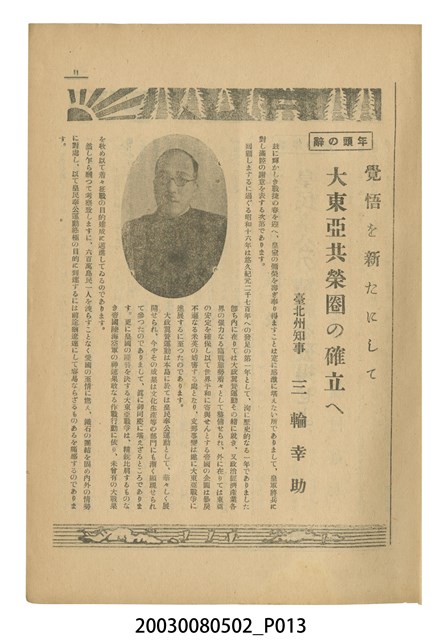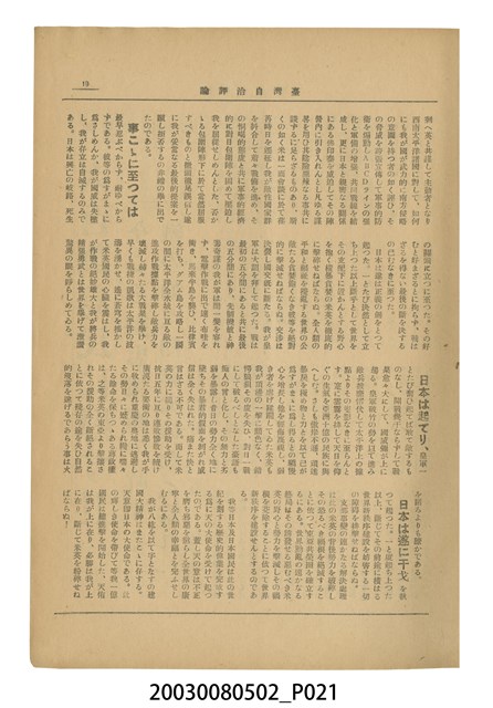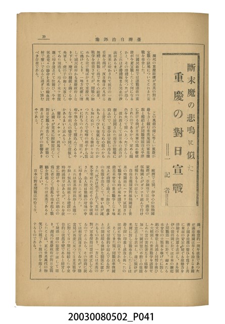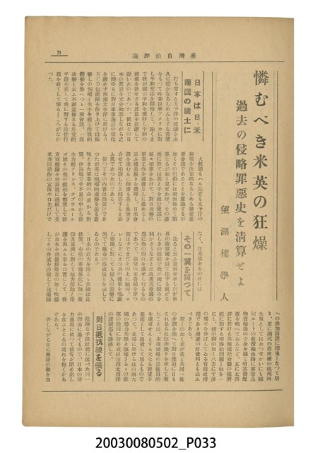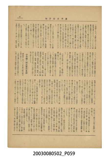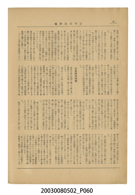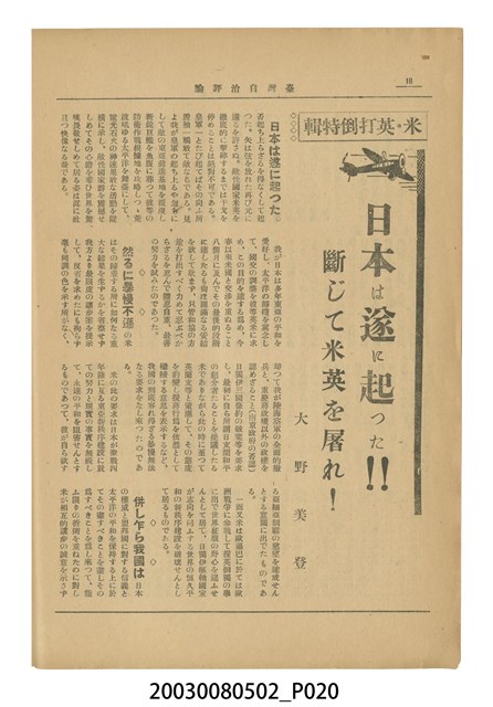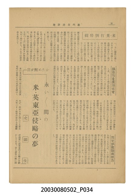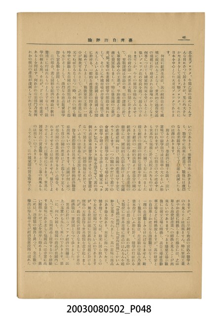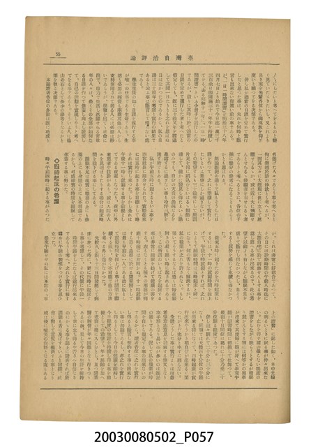 此為一紙質雜誌,並在封面上方寫有本雜誌的標題以及該雜誌的期號,下方則寫上此雜誌的發行者,而封面中間則有本號雜誌的軍人以及日本的插圖。此書為臺灣自治評論社出版之《臺灣自治評論》第七卷新年號。 此物件為《臺灣自治評論》,四宮義任編輯,並於1936年由臺灣自治評論社發行,目的是為配合1935年臺灣總督府實行地方制度改正發行,此刊物的內容包含地方上的自治、政治、經濟等問題與現象,為研究日治時期地方景象的重要書籍之一。 此物件與日治時期的地方自治有關,日本政府於1895年接收臺灣之後,統治制度隨時局變化屢有更替。1919年起施行文官總督制,首任文官總督田健次郎致力推行「地方自治」制度,臺灣各地的地方行政組織漸次走向自治化,但在殖民地高度集權的法律制度下,地方行政組織的從屬色彩濃厚。受到一戰前後「大正民主風潮」、「民族自決」、「朝鮮三一獨立運動」等因素影響,臺灣的知識份子,在1920年代以社會運動的形式於臺灣各地倡導地方自治理念,並於1921至1934年發動多達15次的臺人赴東京國會請願活動。隨著地方政治制度改革運動的日益政治化,臺灣總督府終於1935年賦予地方行政機關法人地位,施行首次選舉、代議等自治措施。