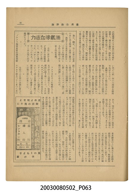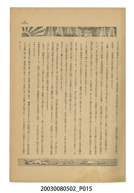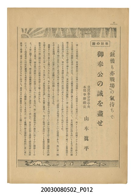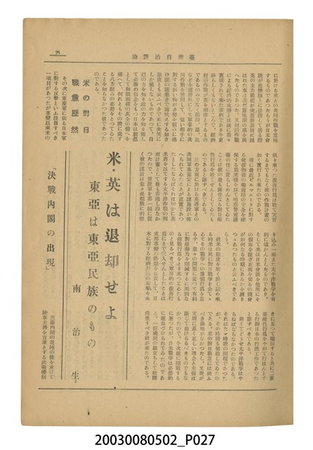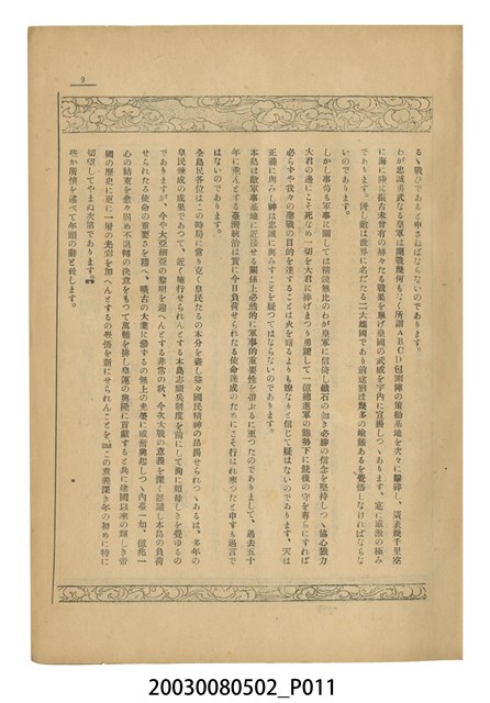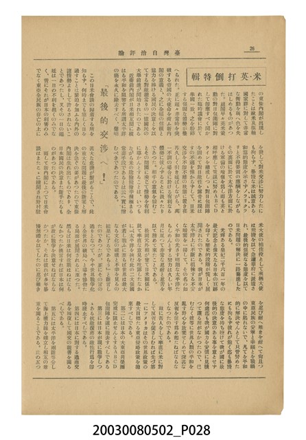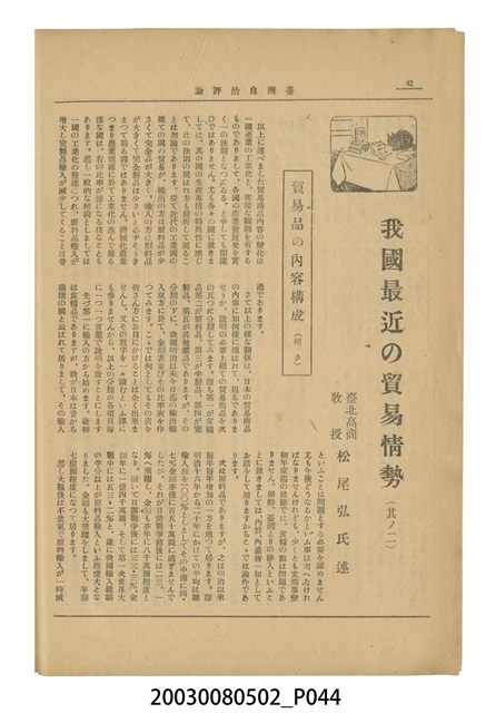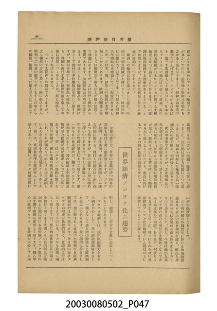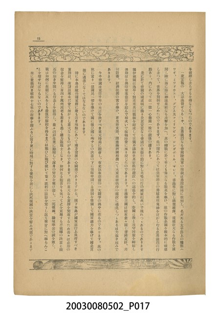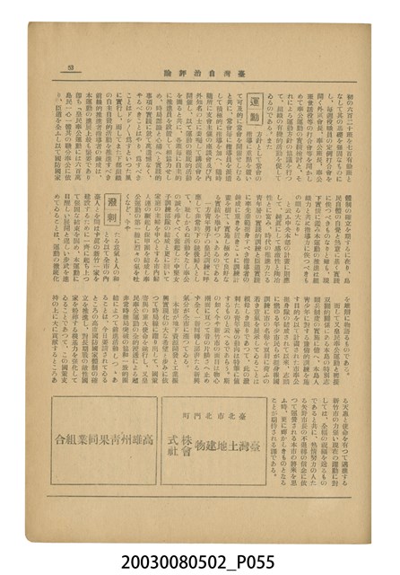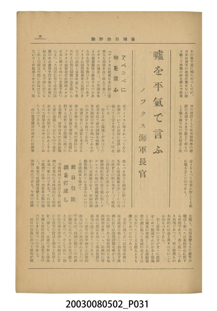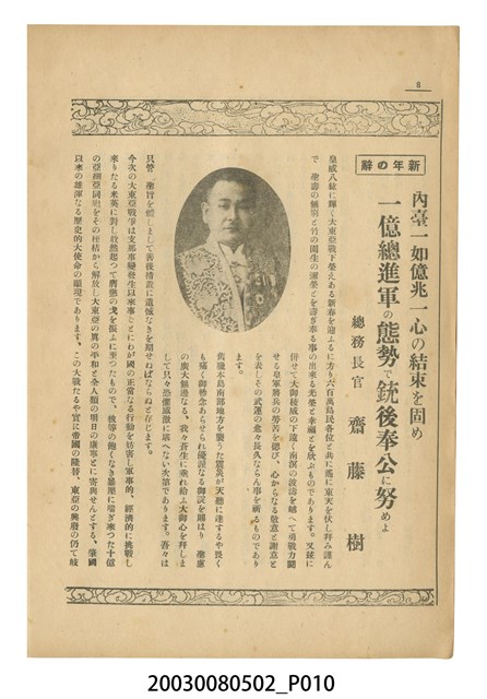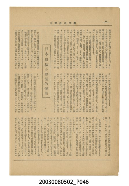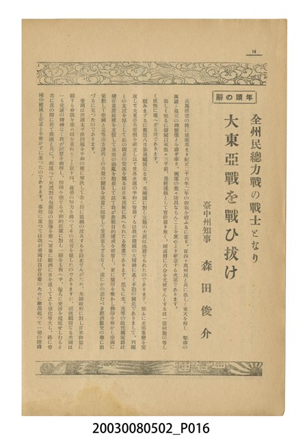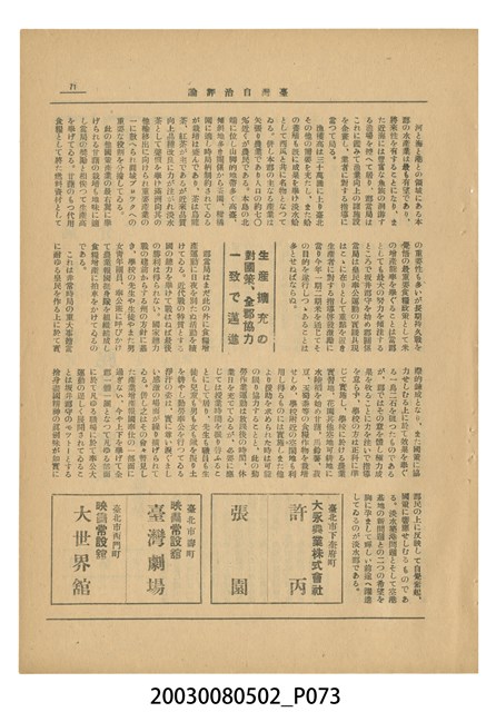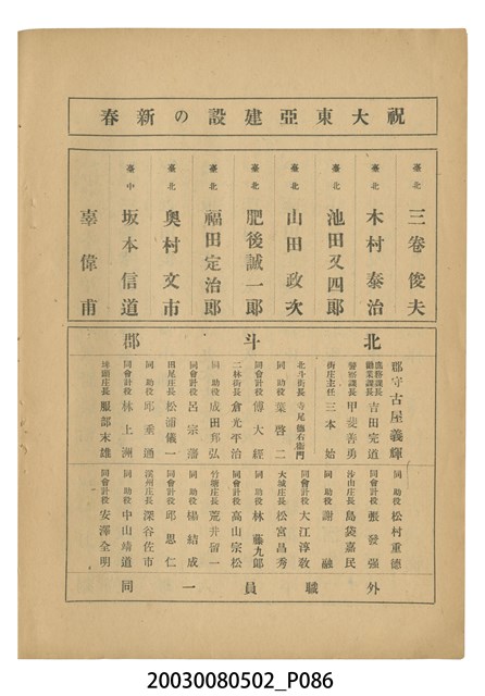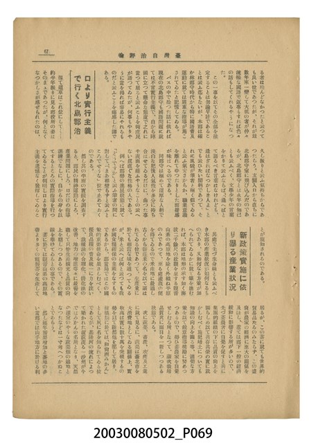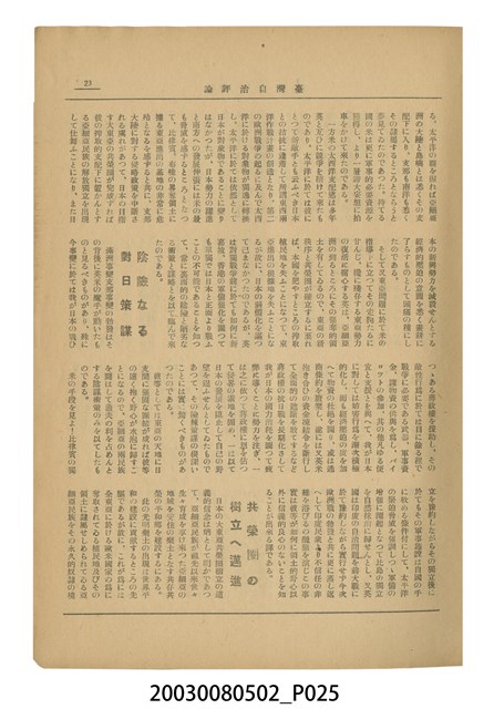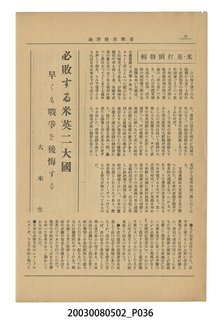 此為一紙質雜誌,並在封面上方寫有本雜誌的標題以及該雜誌的期號,下方則寫上此雜誌的發行者,而封面中間則有本號雜誌的軍人以及日本的插圖。此書為臺灣自治評論社出版之《臺灣自治評論》第七卷新年號。 此物件為《臺灣自治評論》,四宮義任編輯,並於1936年由臺灣自治評論社發行,目的是為配合1935年臺灣總督府實行地方制度改正發行,此刊物的內容包含地方上的自治、政治、經濟等問題與現象,為研究日治時期地方景象的重要書籍之一。 此物件與日治時期的地方自治有關,日本政府於1895年接收臺灣之後,統治制度隨時局變化屢有更替。1919年起施行文官總督制,首任文官總督田健次郎致力推行「地方自治」制度,臺灣各地的地方行政組織漸次走向自治化,但在殖民地高度集權的法律制度下,地方行政組織的從屬色彩濃厚。受到一戰前後「大正民主風潮」、「民族自決」、「朝鮮三一獨立運動」等因素影響,臺灣的知識份子,在1920年代以社會運動的形式於臺灣各地倡導地方自治理念,並於1921至1934年發動多達15次的臺人赴東京國會請願活動。隨著地方政治制度改革運動的日益政治化,臺灣總督府終於1935年賦予地方行政機關法人地位,施行首次選舉、代議等自治措施。