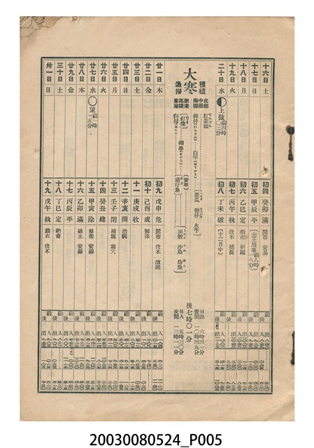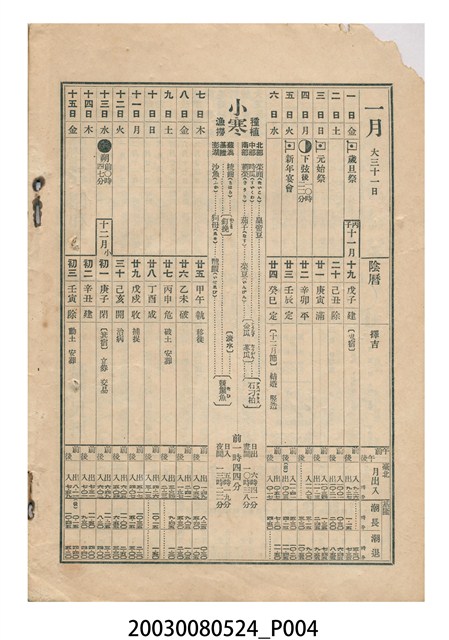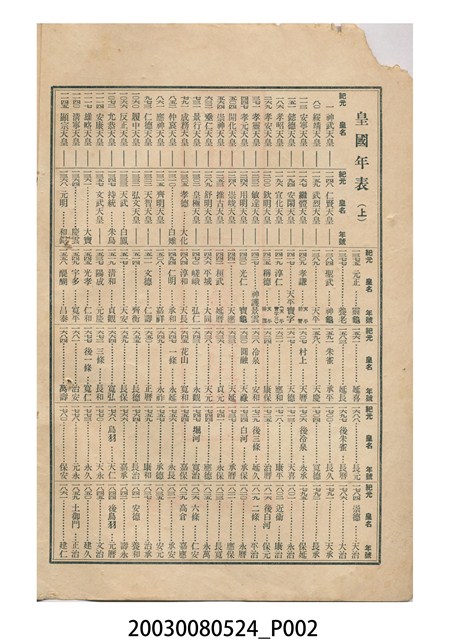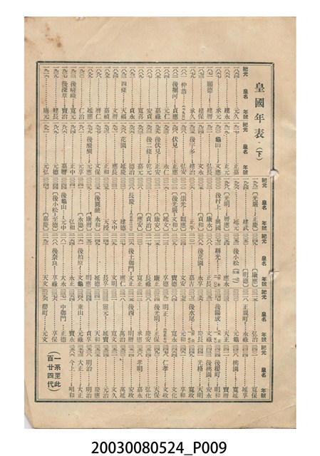 2.封面裡為「皇國年表(上)」、封底裡為「皇國年表(下)」載歷代天皇登基時間,歲時節慶多與日本民俗相關,不見現今臺灣熟悉的節慶,表上記有「歲旦祭」、「元始祭」、「新年宴會」、「紀元節」、「春季皇靈祭」、「神武天皇祭」、「天長節」、「始政紀念日」、「秋季皇靈祭」、「神嘗祭」、「臺灣神社祭」、「明治節」、「新嘗祭」、「大正天皇祭」。