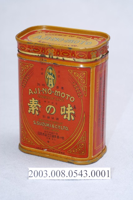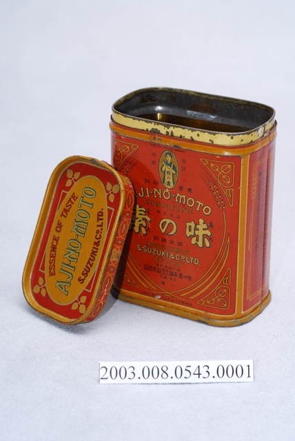 本件味之素鐵罐為味之素本舖株式會社鈴木商店製味之素鐵罐組之部件1,呈長6.7公分,寬4.2公分,高9.1公分之直式扁身長方體,又可分為罐蓋與罐身2部件。鐵罐表面以紅色與黃色為主視覺色,罐蓋頂緣帶唇,頂面作內凹樣式,內印有紅底橢圓形黃底框,其四端角有3葉枝條延伸裝飾,框內印有英文公司名稱與羅馬拼音商品名稱。罐身以黃色為底色,除背面之外,3面以紅色作底框。正面以麥稈於左右側成圓框,其4端角作3枝葉卷紋。框內上端為味之素商標,於直式橢圓形框內,身穿印有味之素字樣的圍裙之婦女圖像。中段處以白字橫書「味の素」與其羅馬拼音。下端印有「宮內省御用達」、「味の素本舖株式會社鈴木商店」字樣。背面則為倉品特色與說明之英譯。左右兩側以黃色麥稈成框,內印商品說明與商品特色文字。