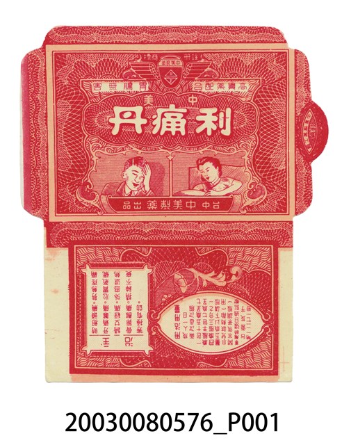 1.本件中美製藥「利痛丹」藥品包裝袋,紙質,紅色單色印刷,呈尚未加工黏貼展開紙卡的狀態,封面以「中美 利通丹」藥品名稱文字搭配2位人物患病圖做為主視覺圖,再輔以大量的幾何、曲線、花草紋飾填充裝飾整個版面,主圖正上方印有中美商標及「高貴藥配合 腸胃無害」標語,主圖下方印有「台中 中美製藥 出品」。封底同樣為紅色幾何框線搭配繁複的線條、花草紋飾的設計,框內印有主治效能、用法用量以及「藥劑師張日通監製」與「台衛成字一二七一号」等藥品相關資訊。從封底說明可知該藥主治時邪頭痛、身熱頭痛、牙痛喉痛、心胃氣痛、婦女經痛、外感退熱、骨骼酸痛及精神不爽等病症,為常見的家庭成藥。2.臺灣早期成藥包裝形式風格受日本殖民影響,時常出現以簡潔俐落的文字、插圖加上幾何、花草紋飾邊框裝飾,或是旭日、櫻花、武士或不倒翁等日本東洋風格的設計3.日治時期臺灣在政府扶持下,西醫取代漢醫成為醫療主體,以科學漢方為主的家庭成藥亦可列為醫生之處方用藥,藥廠或藥房所生產的加工成藥或家庭藥,其成份多有中、西藥成份混和的情形,而這些家庭成藥因透過寄藥包服務而使用方便,價格合理,廣受民眾歡迎,二戰後仍盛行,至1970年代臺灣醫療普及後才逐漸式微。4.中美製藥(原中米藥房)成立於1936年,提供臺灣中部鄉里家庭寄藥包服務,1947年改名並生產各式西藥,1968年後又改組擴大為中美製藥兄弟股份有限公司,為知名本土藥廠之一。