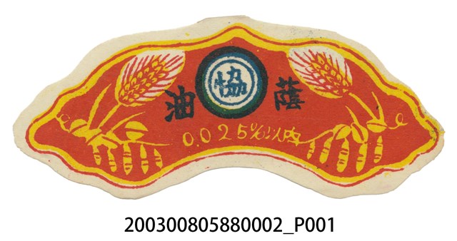 1.此物件為南投草屯協興醬油工廠正蔭油小商標紙,呈不規則狀,下方「0.025%以內」無法判定為何成分。標明由草屯協興醬油工廠製造,有一協記商標於上。