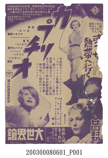 1.本物件為電影宣傳海報1張。海報上方寫有電影名稱「カプリチオ」(Capriccio),並印有多幅演員劇照,海報以日文簡介電影內容、導演、作曲及主演者;海報左側印有「滿台映畫協會配給」字樣;海報下方有「大世界館」、「十一月十六日三協社印刷」、「十九日古矢セン發行」、「最新入荷全プロ封切階下席七○階上席ボツクス一(BOX)○○(稅共)」、「廿日封切」字樣。電影Capriccio是1938年德國歌舞喜劇電影,描述中世紀法國一位年輕女子,女扮男裝一系列浪漫冒險的經歷,由Karl Ritter執導,Lilian Harvey,Viktor Staal和Paul Kemp主演。