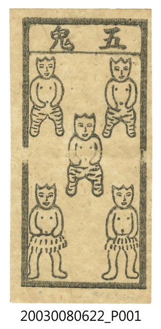 本件五鬼紙錢採直幅構圖,以單一墨色印製在鵝黃色的草紙之上,上端框內橫書「五鬼」二字。下方框內區分上下三排立有五鬼形象,中央一位而上下各兩位,每位鬼皆作頭長犄角、上身赤裸裝束,上方三鬼下身穿虎紋長褲,下方二鬼下身穿草裙。