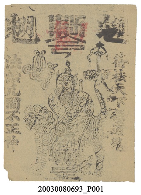本件天師鎮宅版印符令,為結合神禡所印製之鎮宅大符。符令以墨版印製於米黃色紙張之上,並加蓋朱紅色法印而成。畫面上端中央書上下相連的「勅令」兩字,並蓋上一方朱文「道經師寶」的道教三寶法印,兩側書有兩個分別由「鎮宅」、「光明」所組合而成的複文文字。畫面中央為張天師像,張天師跨坐於尾巴高翹、頭朝左方的黑虎背上,雙手朝右合持一只朝笏,頭部左右分別有一方印章與一把寶劍,張天師兩側又有一副對聯,分書「符祛天下無道鬼」、「法治凡間不正神」。