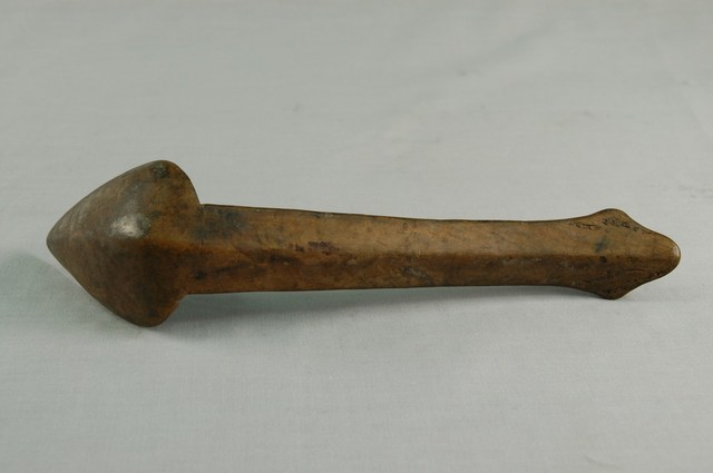 2. 本件木匙以一塊木材雕刻而成,器表呈黃褐色,器表正反無任何雕紋與彩繪。構造可分為勺部(bowl)及柄部(stem),柄部與勺部所成之角度較大,約90度左右,使用時勺部所盛之液體較不易流失。勺部呈三角形(陳奇祿稱「瓜子型」),最寬處近柄部;柄部長度較勺部長,末端雕刻成三角形折角,木匙背面帶一中脊,自匙柄延伸至勺部。