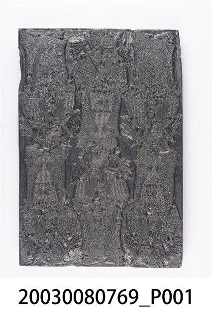 本件為門神印版,由一塊薄方形木板陽刻而成,共三對門神屬於同一組門神組合,依造型近似秦叔寶與尉遲恭,為民間最常見的門神。手持的兵器民間版本眾多,但大多出現秦叔寶手持一對金鐧而尉遲恭則持鐵鞭。印版結合雕刻和印刷藝術,古代廣泛運用在刊印書籍,宗教民俗的版畫、符令、籤詩、疏文等印刷物上。