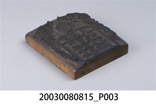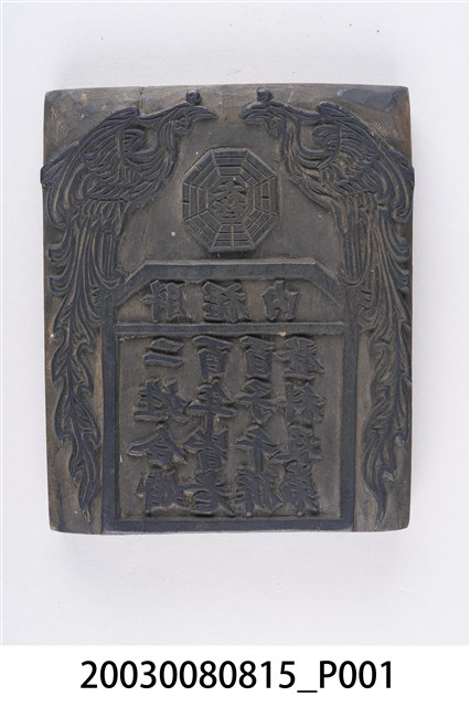 本件為□裙內印版,由一塊長方型木板雕刻而成,兩隻鳳凰代表鳳凰于飛、鸞鳳和鳴,太極八卦圖表示避邪祈祥,圭形圖刻「□裙內」、「二姓合婚百年皆老百子千孫登科及弟」。為慶賀新婚夫妻之印版。印版結合雕刻和印刷藝術,古代廣泛運用在刊印書籍,宗教民俗的版畫、符令、籤詩、疏文等印刷物上。
