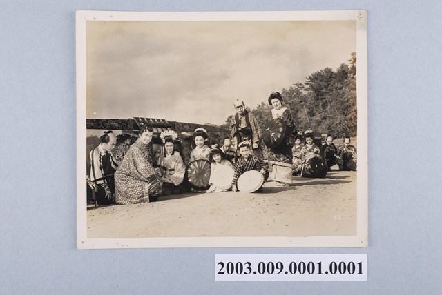 日本電影《豆狸忍術合戰》的黑白劇照之一,正面為劇中白菊姬(筑紫明美飾演)與由二隻狸化身的女童(たん子,松島智子飾演)、男童(たん吉,小畑靖飾演)與隨從們安全抵達江戶,若殿藤四郎(和田孝)迎接的場景,背面則另有「中一行影業部」、「豆狸忍術合戰」、「第 張」、「共計 張」等藍色蓋印字樣。