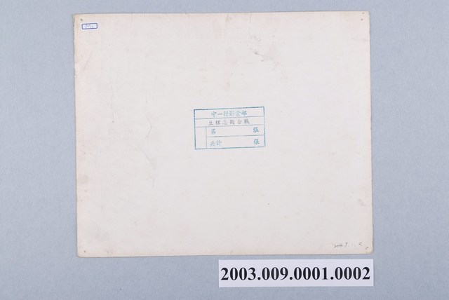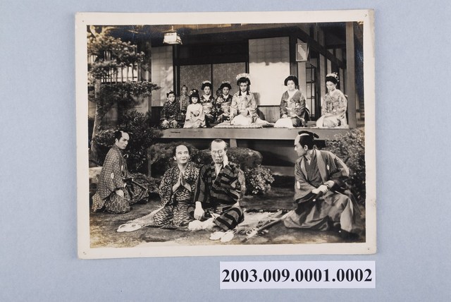 日本電影《豆狸忍術合戰》的黑白劇照之一,正面為劇中白菊姬(筑紫明美飾演)等人坐在走廊審問二位浪人的場景,背面則另有「中一行影業部」、「豆狸忍術合戰」、「第 張」、「共計 張」等藍色蓋印字樣。